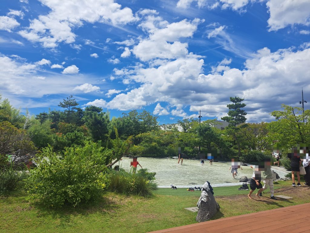 街中の大きな商業施設ながら、たくさんの緑に囲まれて水遊びをすることができます。